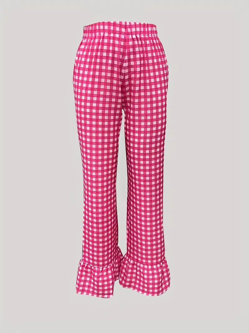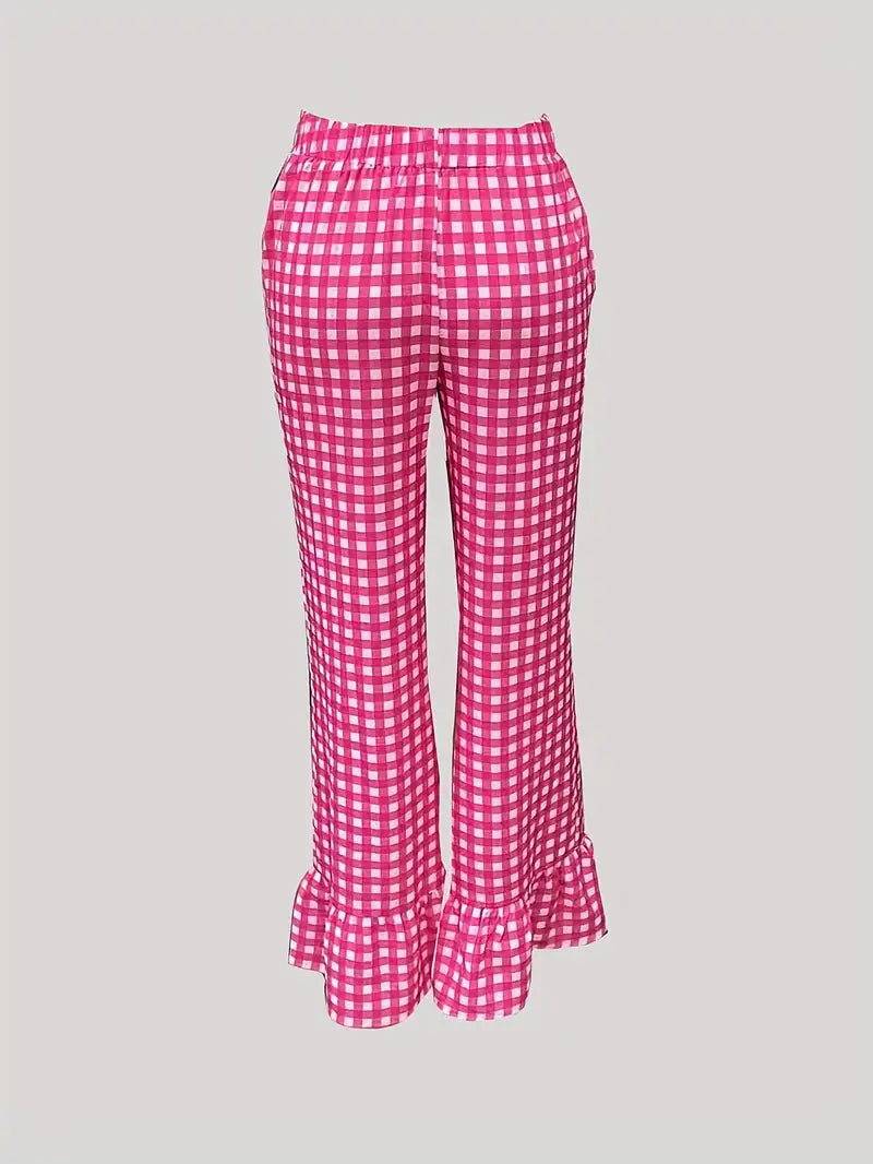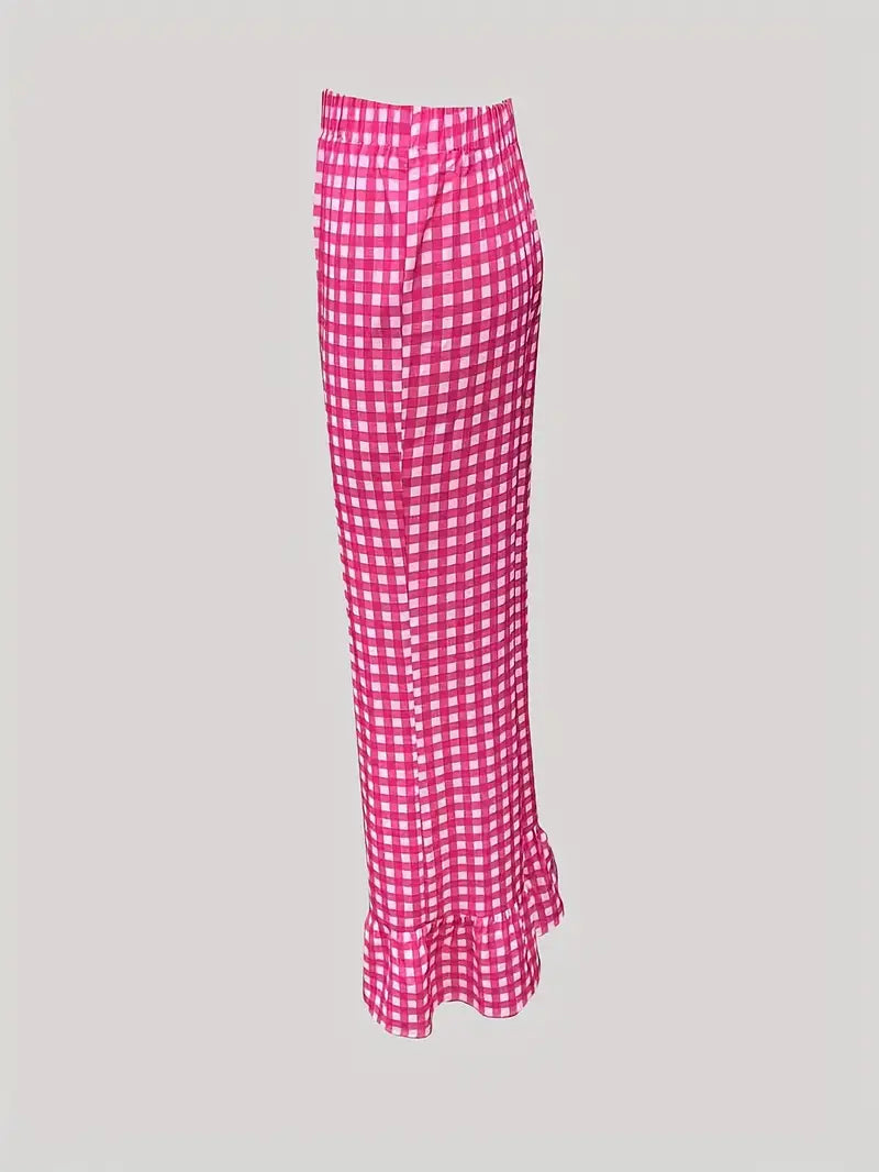Step into effortless style with these playful pink and white gingham wide-leg pants. High-waisted for a flattering fit, their flowing polyester fabric keeps you comfy and chic all season long. Perfect for casual days when you want to feel breezy and bright!