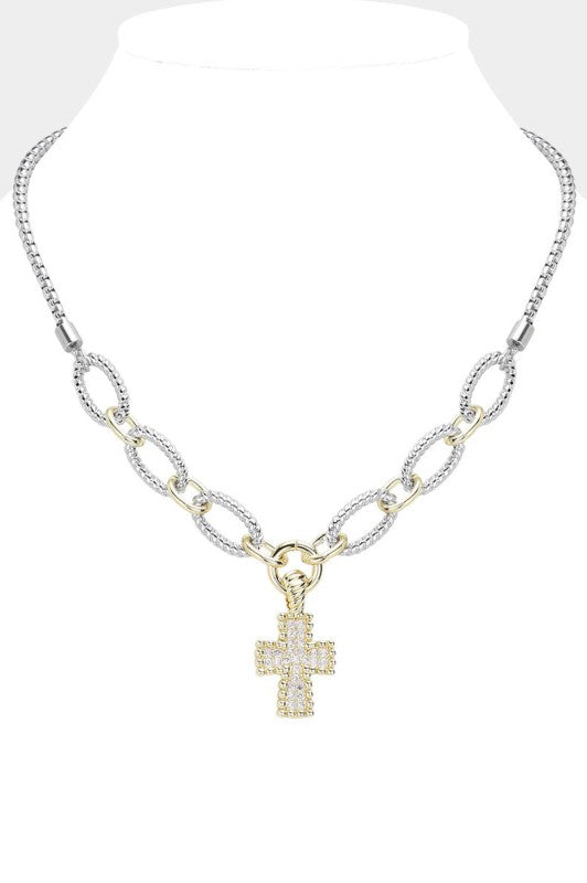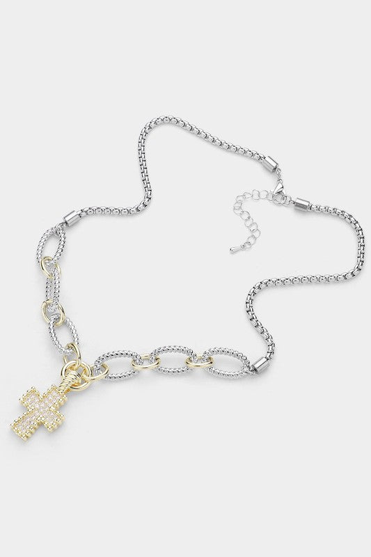Elevate your everyday style with the Ellery Cross Pendant Necklace—a stunning two-tone design that blends timeless elegance with modern sparkle. Featuring a 1.6" cross pendant adorned with brilliant cubic zirconia stones and finished in luxurious 14K gold plating, this piece catches the light beautifully from every angle. The adjustable 18" + 2" chain ensures the perfect fit for layering or wearing solo. Whether you're dressing up for a special occasion or adding a touch of glamour to casual wear, this versatile necklace is your go-to accessory for making a radiant statement.
