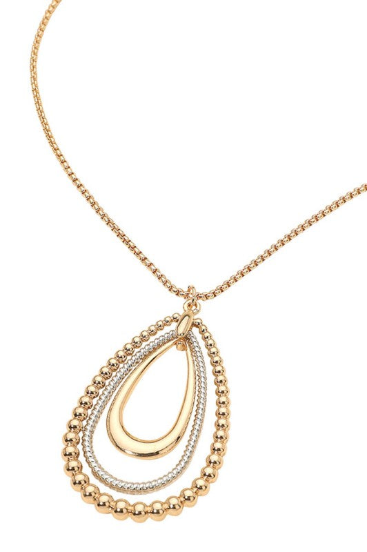 Jara Necklace brings effortless sophistication to your jewelry collection. This stunning long necklace features layered open teardrop pendants with mixed textures that dance and sway with every movement. At 34.5" plus a 3.5" extender, it's perfectly proportioned to layer or wear solo. Whether you're dressing up your everyday style or adding the perfect finishing touch to an evening look, this refined statement piece delivers elegant versatility. Lead and nickel compliant for worry-free wear.