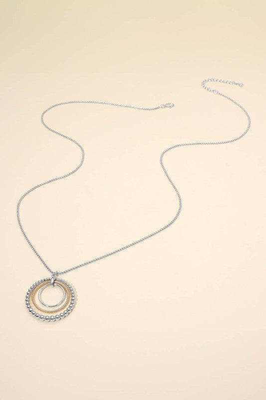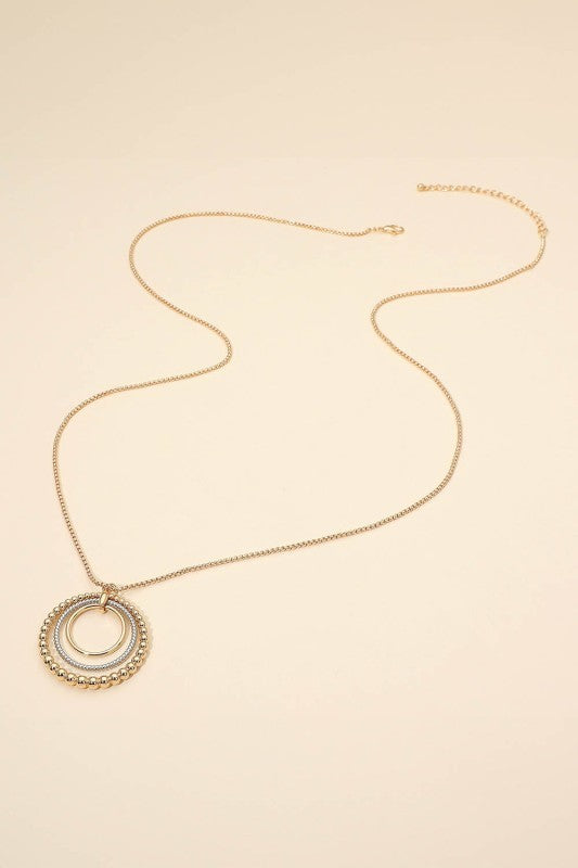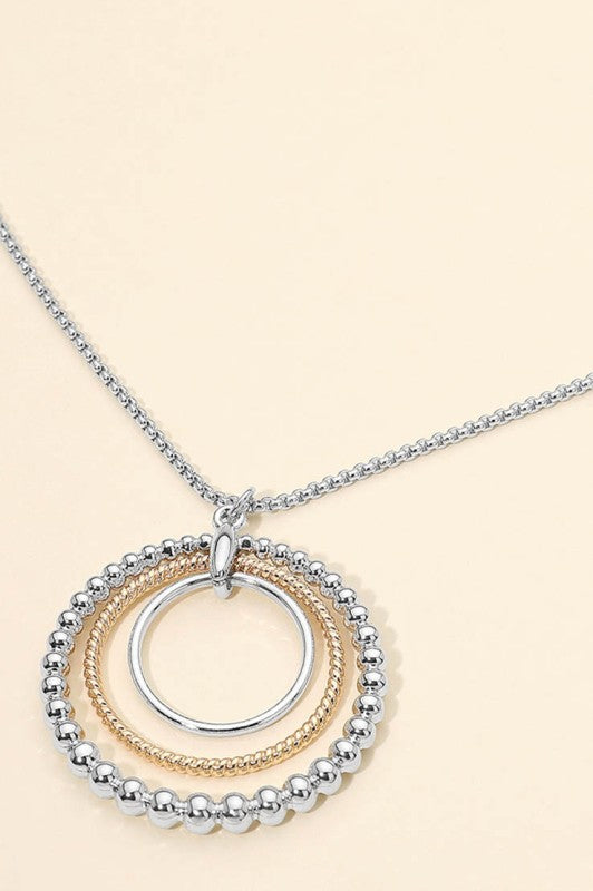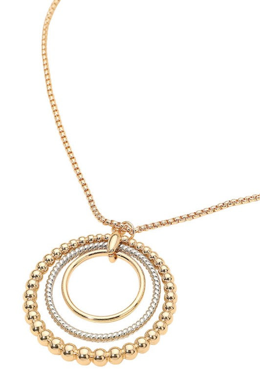 Make a statement with the Lone Bubble Layered Ring Necklace—where modern design meets playful elegance. This 34.5" adjustable chain showcases a stunning 1.7" x 1.75" pendant featuring layered circular rings with contrasting textures that catch the light beautifully. The dynamic interplay of surfaces creates subtle movement with every wear, effortlessly elevating casual looks or adding that perfect finishing touch to special occasions. Lead and nickel compliant for worry-free styling. A versatile piece that brings contemporary flair to any jewelry collection.