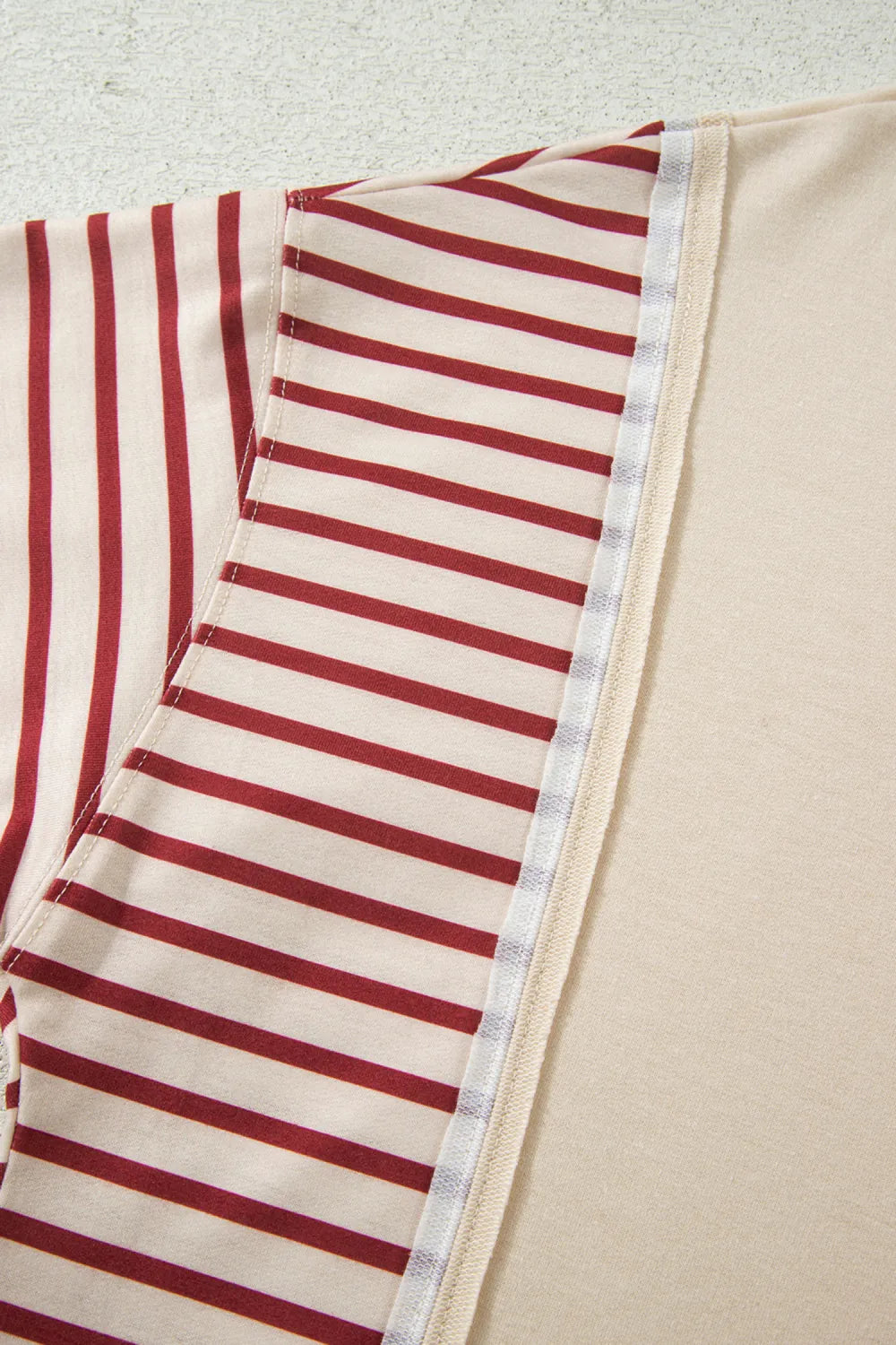 Make a statement with the Cilla Casual Knit Top, where bold red stripes meet modern patchwork design. This relaxed-fit pullover features a round neckline, drop shoulders, and an on-trend high-low hem that keeps things interesting. Strategic side and sleeve slits add an edgy touch, while the striped patchwork sleeves bring playful personality to your everyday wardrobe. Perfect for effortless style that turns heads.