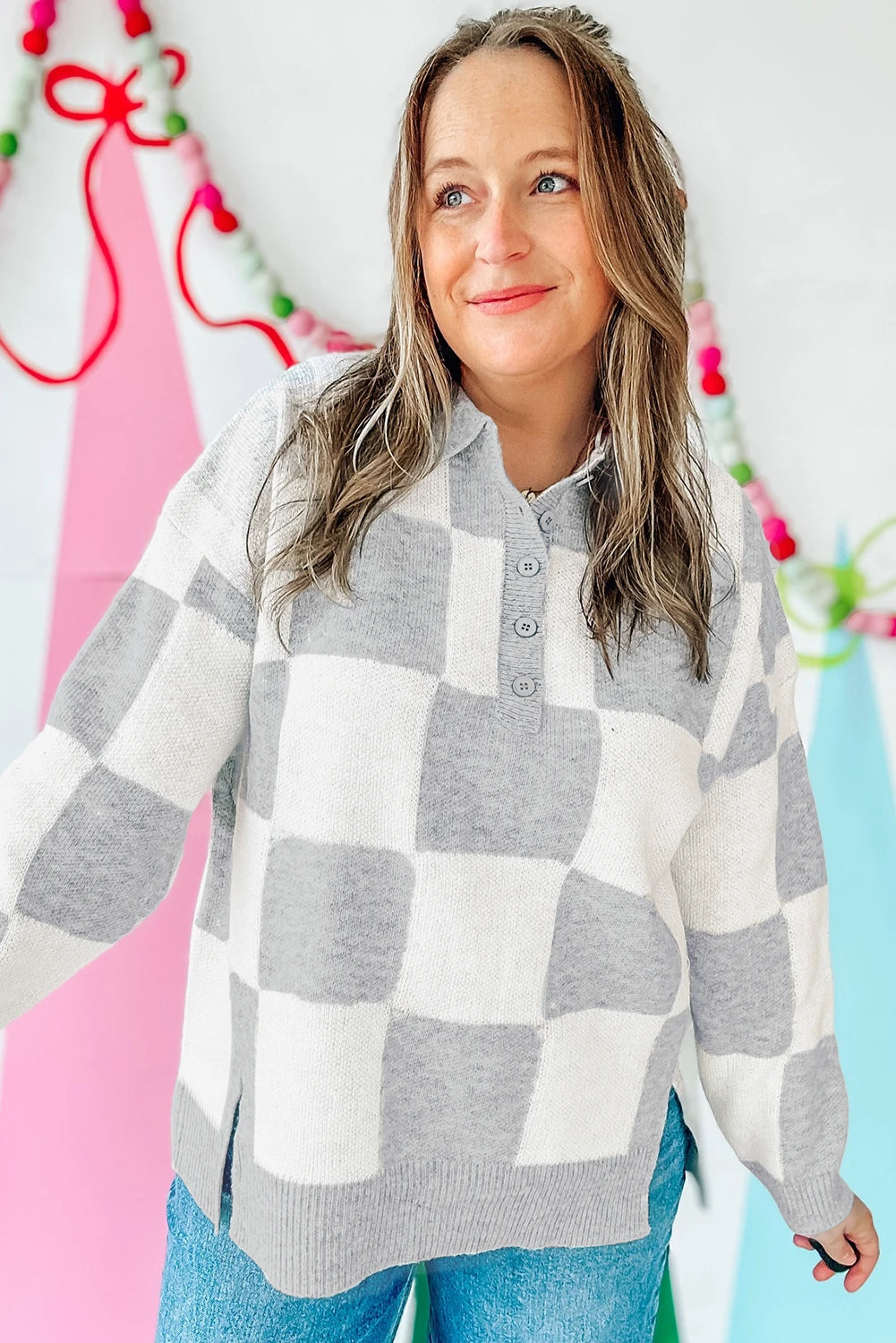 Get cozy and chic with the Dawson Checkered Sweater! This plus-size knit features a playful gray checkered pattern, a classic polo collar with buttons, and relaxed drop shoulders for easy layering. The side slits add a dash of style and comfort, making it perfect for those crisp fall and winter days. Embrace effortless cool with this sweater that’s as comfy as it is cute.