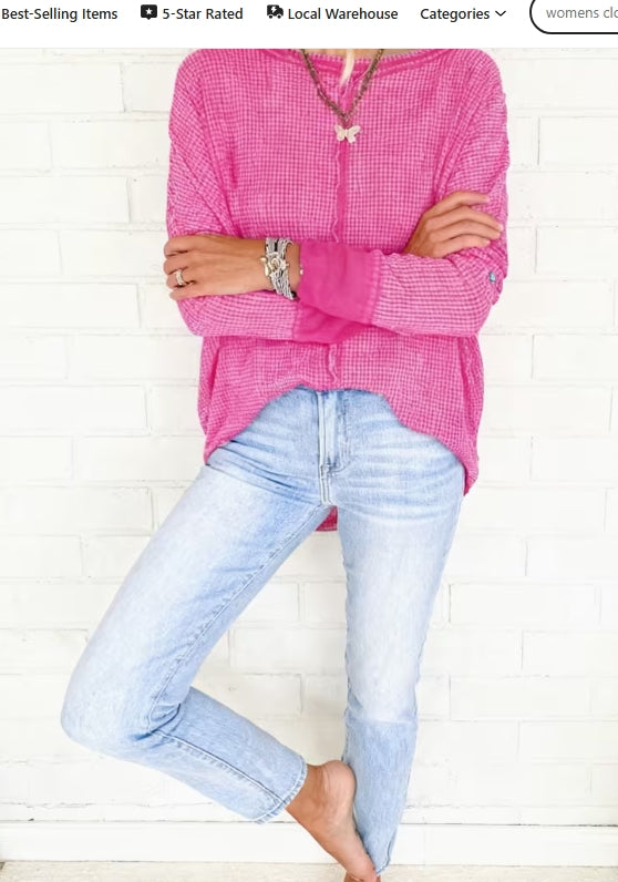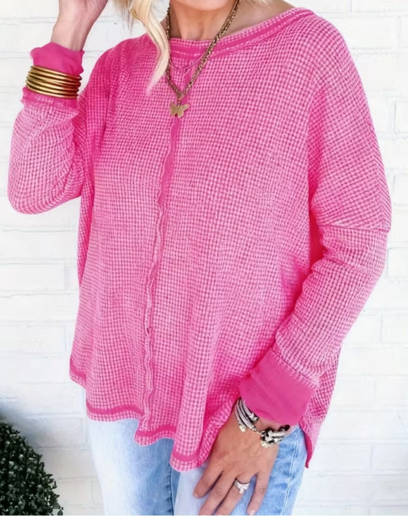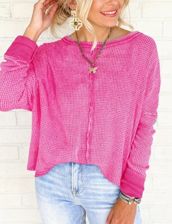 Wrap your little one in cozy comfort with this waffle-knit long sleeve top! Featuring a trendy drop shoulder design, curved hem, and playful back patch detail, it's the perfect piece for fall and winter layering. The raw hem adds an effortless, modern touch that kids love. Whether paired with jeans or leggings, this versatile top keeps them warm and stylish through the chilly seasons. Soft, snug, and oh-so-cute!