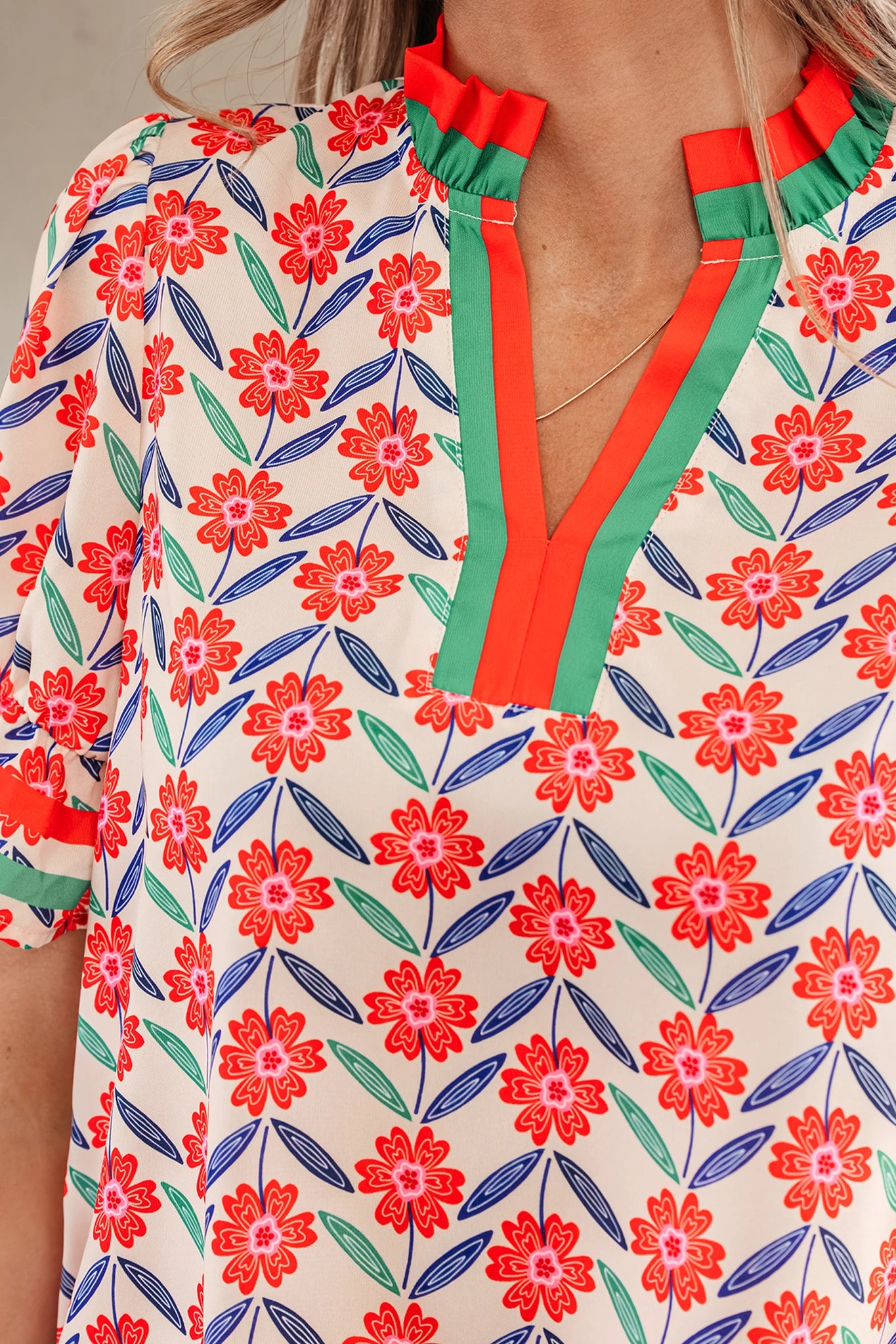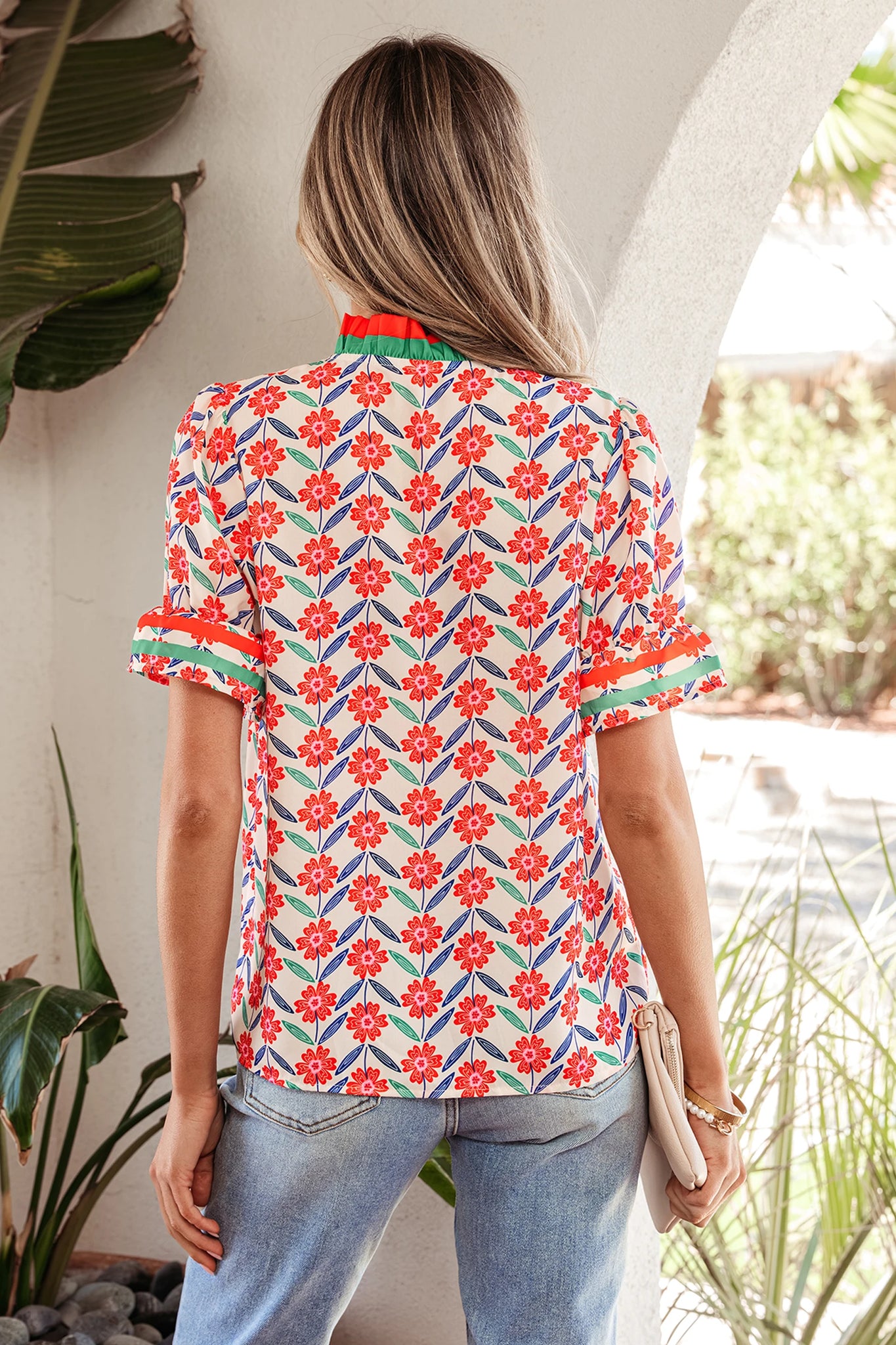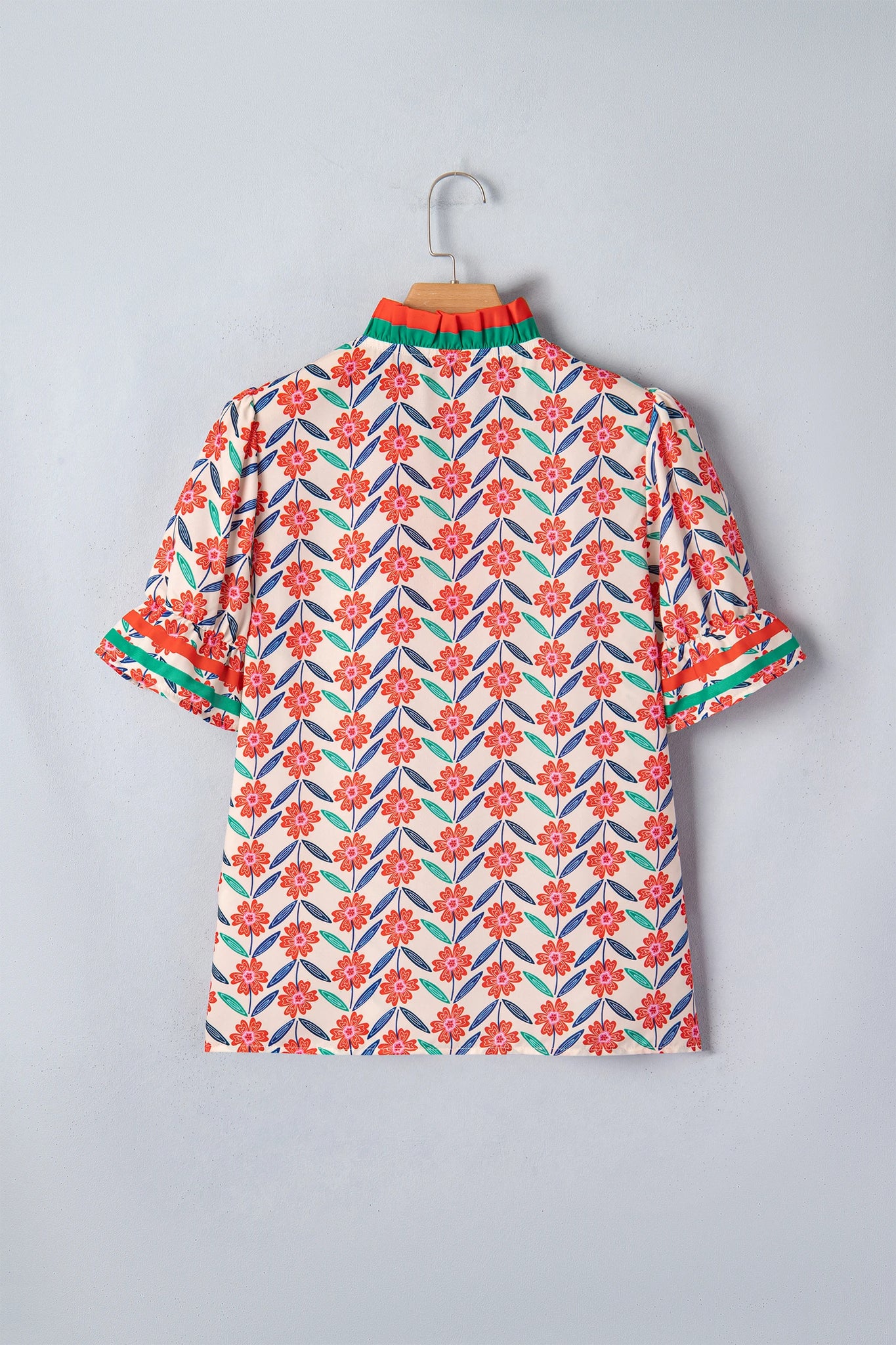Step into effortless style with the Sienna Floral Top. This exquisite blouse features a charming floral design paired with striped color block trimmings that add visual interest. The ruffled collar and V-neckline create a feminine silhouette, while puff sleeves bring a playful touch to your wardrobe. Crafted from soft, lightweight fabric, it's the perfect choice for warm-weather styling—ideal for casual outings, weekend brunches, or layering over your favorite basics. Versatile and comfortable, this top transitions seamlessly from day to night.