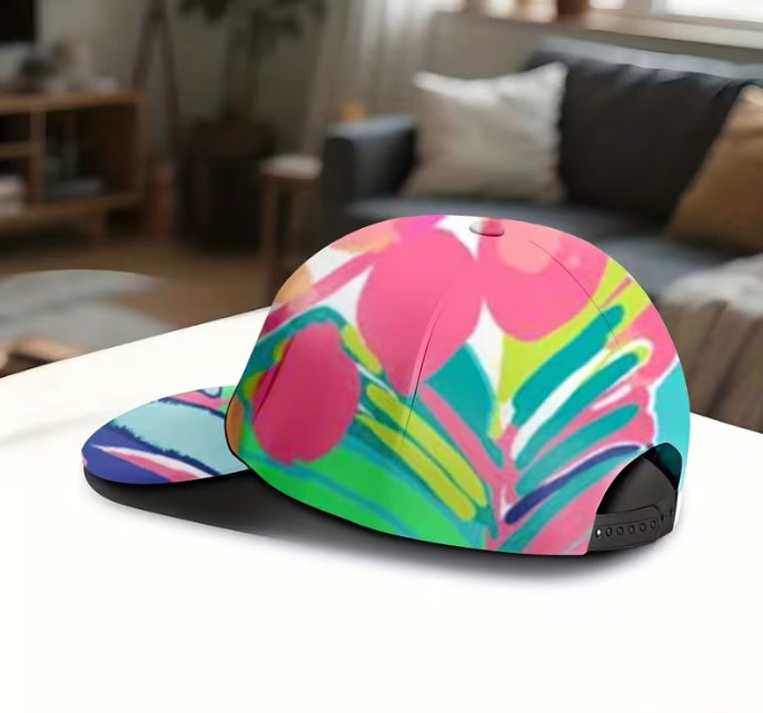 Bring tropical vibes wherever you go with the Spring Fling Cap. This lightweight adjustable snapback features a vibrant full-body print showcasing coconut palm leaves and island-inspired designs that capture the essence of a Hawaiian getaway. Perfect for sunny days at the beach, casual outings, or adding a playful pop of color to your everyday look. The comfortable snapback closure ensures a secure fit for all head sizes, while the adorable tropical aesthetic makes it an instant conversation starter. Embrace the aloha spirit with this must-have seasonal accessory.