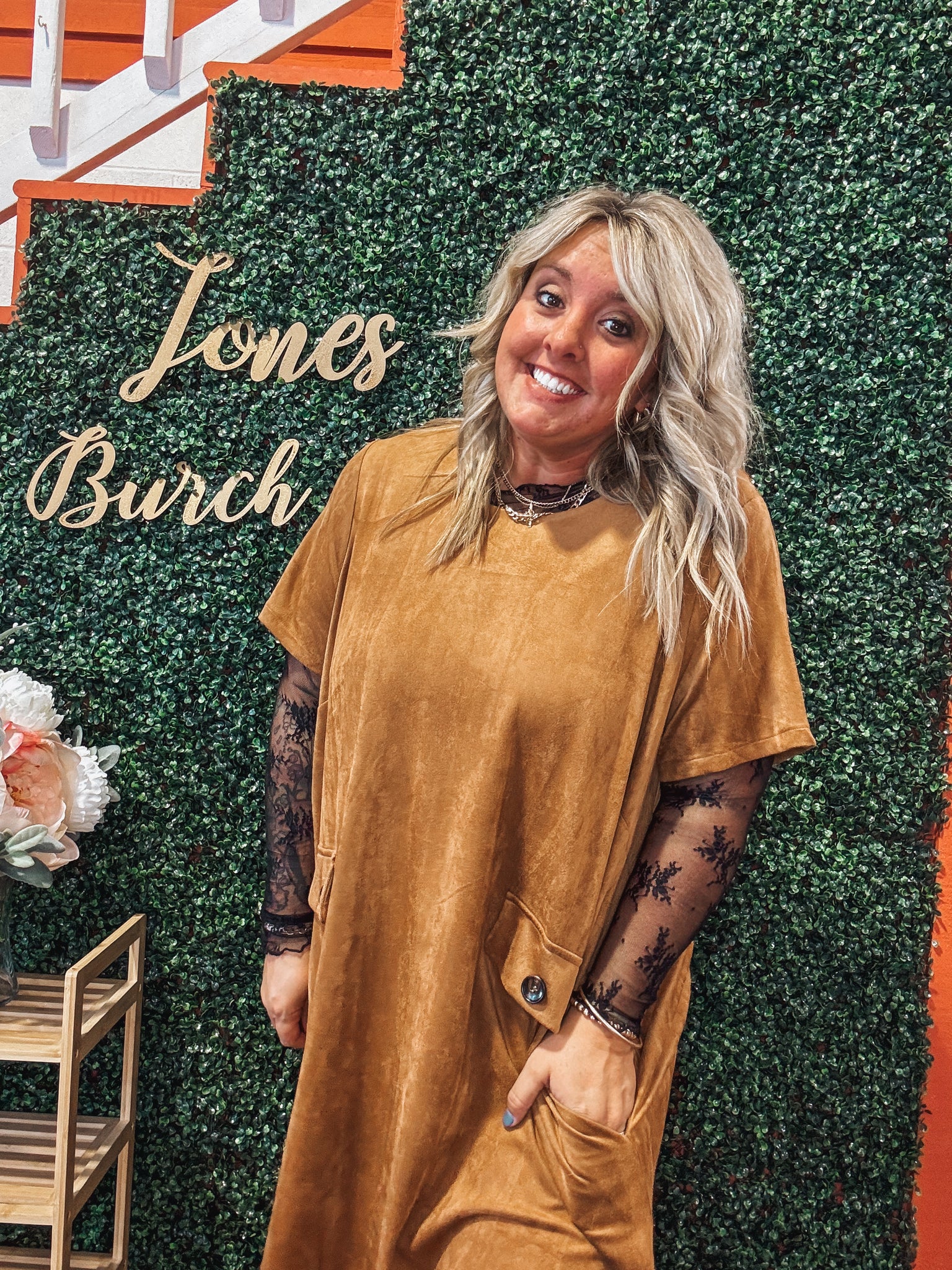Expertly crafted from luxurious faux suede, the Francesca Shift Dress in Curvy is the epitome of softness and style. Dress it up for a special occasion or keep it casual for everyday wear. The oversized fit adds a touch of modernity while the camel color exudes effortless sophistication. Plus, with functional pockets, it's as practical as it is beautiful. Don't miss out on this must-have dress.