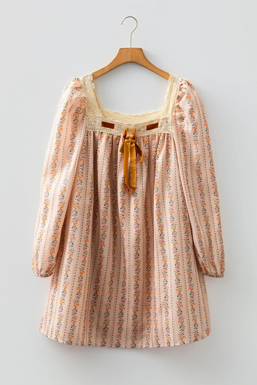 Meet your new go-to dress for effortless charm. This prairie-inspired mini features a delicate vertical floral print in khaki tones, paired with a show-stopping velvet bow at the square neckline. Luxe lace trim and bubble sleeves add romantic flair, while the loose, flowing silhouette keeps things comfy and chic. The thigh-high cut is perfect for showing off your legs with mid-boots or sneakers. Sophisticated, playful, and totally wearable—this is the dress that does it all.